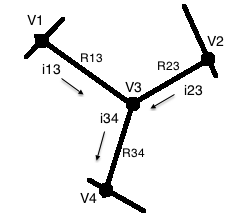 V1/R13 + V2/R23 + V3*(-1/R13 + -1/R23 + -1/R34) + V4/R34 = 0因此,我们在4个变量中有一个方程。我们所需要的是另外3个方程,我们应该能够解出所有的V,在N个变量中找到N个方程之后,你需要想出一个软件来解决这个方程组。我帮不了你。祝你好运:)