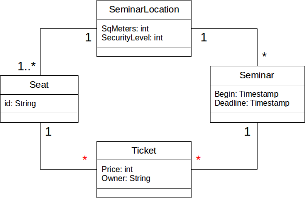 票可以是一个座位和研讨会之间的联系班。或者使用OCL来表示这个约束。