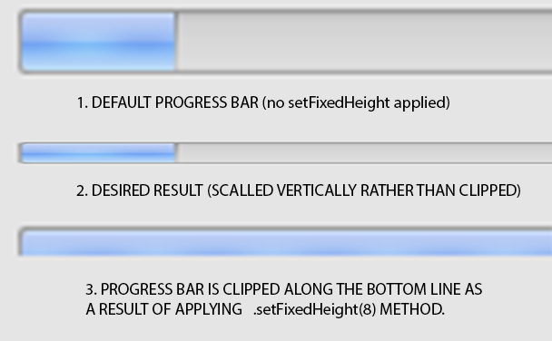 我想通过使QProgressBar变得瘦来定制它的外观。有一个可用的setMaximumHeight()方法。但不幸的是,剪裁(或剪辑)的高度,进度栏,使它看起来很奇怪。相反,我宁愿纵向地挤压或缩放它。在OSX平台上,裁剪问题尤为突出。图示如下: