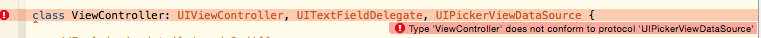 我只是在Swift中创建了一个新的类,它叫做myViewController,它是一个UIViewController。现在我试着把它变成UIPickerViewDelegate和DataSource,但是我犯了一个奇怪的错误