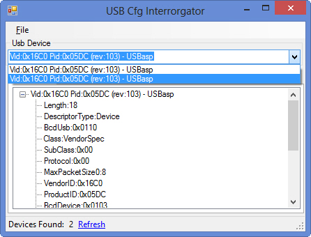 现在软件部分:使用简单的迭代在我的libusb 32设备上使用LibUsbDotNet,我找到了两个设备。它们都被命名为相同(并且具有相同的VID和PID),所以我认为这是一个复合设备。第二种方法有一些数据。下面的截图很好地显示了这一点。
