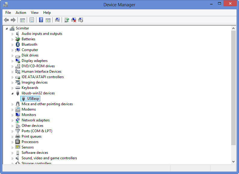 我有AVR微控制器的usbasp程序员。这个程序员使用libusb库。我成功地将它连接到pc上,系统检测到了新的设备,并成功地为该设备安装了驱动程序。它工作得很好,因为我可以用它编程AVR芯片。所以硬件部分是100%可以的。