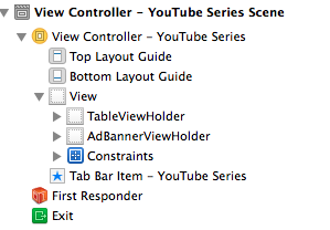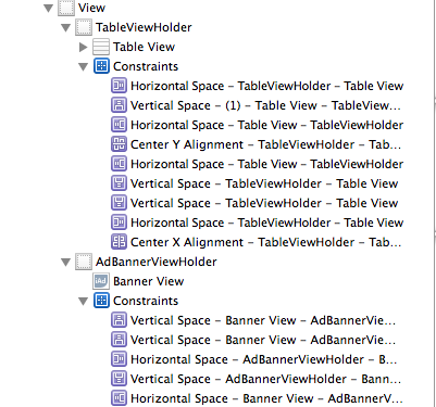 其中as视图控制器有两个用作占位符的视图,上面是iAds的,下面是持有表的视图。这个主意是幕后黑手。如果广告没有加载,我将将视图的高度设置为零,这将容纳iADBanner。所以表视图占用了所有的空间。(这是雷·温德利希的应用程序给我提出来的。)我最初是挣扎于自动布局,但我做了正确的,所以当sim进入纵向模式时,这个视图占据了全部宽度。但不知何故,我无法确定持有tableView的视图的高度。下面是约束的屏幕截图。