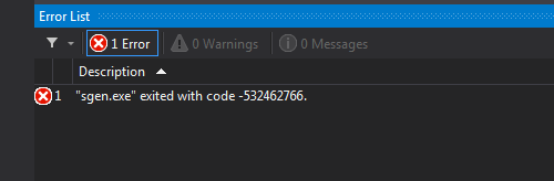 我了解到sgen.exe是一个XML序列化生成器工具。此错误还发生在使用Release配置的构建过程中。