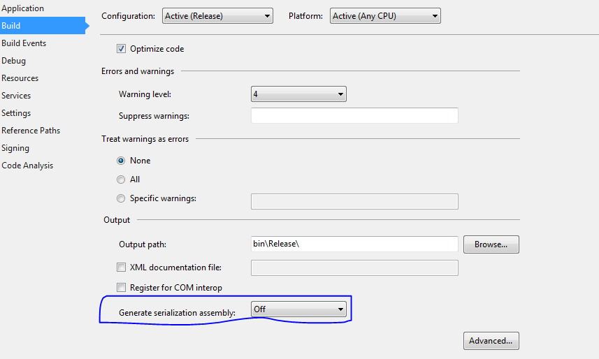 可能是一个肮脏的修复,但我查看了输出窗口,以确定哪个项目抛出了此错误。在找到导致这种情况的项目之后,我立即打开该项目的属性,转到build选项卡,并禁用“Generate序列化程序集”。