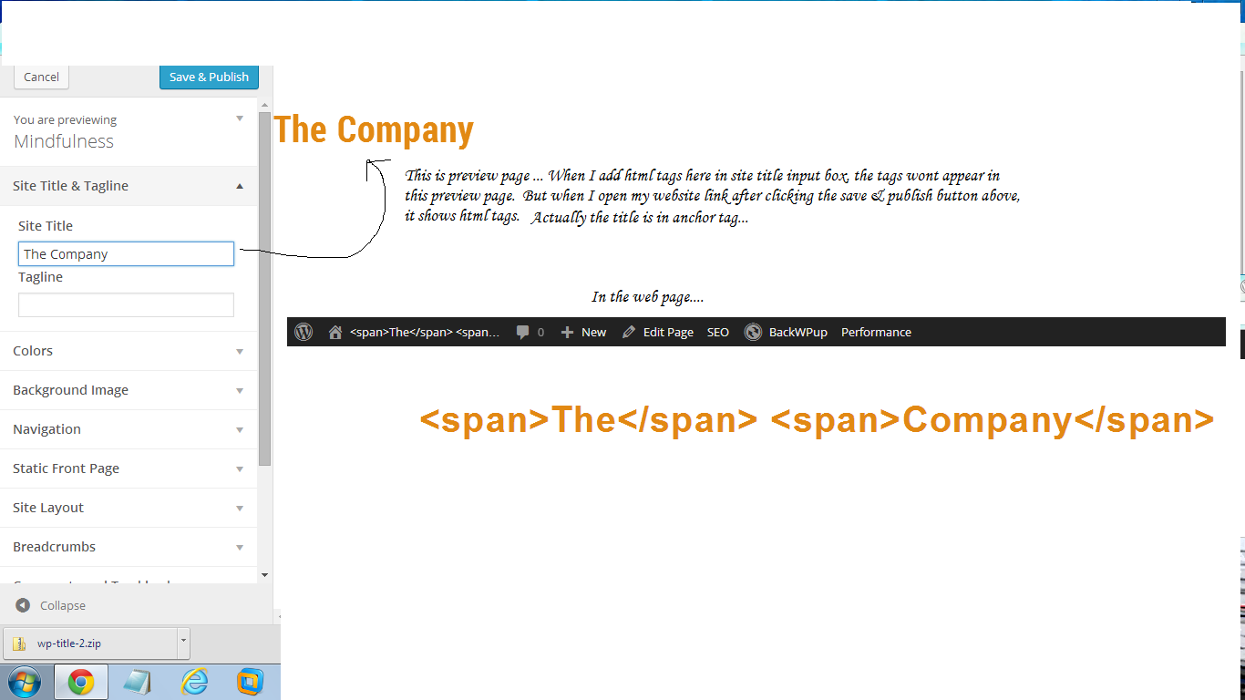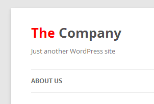 在我的WordPress标题是两个词(例如“公司”)。现在,默认的颜色是蓝色。但是我希望上面的例子中的" the“部分是灰色的。我在站点标题输入框中使用了字体标记并将其设置为<font color="grey">The</font> Company。在预览页中,它显示正确,但当我访问我的页面时,它显示为