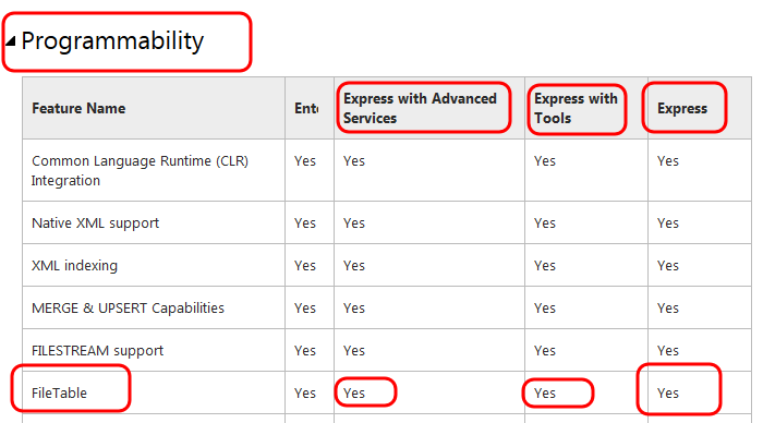 快速浏览Server版本对特性的支持和搜索FILETABLE显示:是,Server Express确实支持文件表