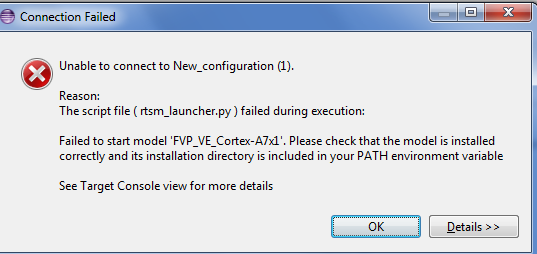 我正在使用DS5评估版本。我在EclipseforDS5中创建了一个简单的hello项目。在创建项目时选择的项目类型是裸金属可执行文件->空项目。选用工具链ARM编译器5。我编写了代码并生成了axf文件。当我右键单击axf文件并选择debug as->debug配置->Connection选项卡->ARM FVP VE_Cortex_A7x1->裸金属调试-> debug Cortex-A7,然后单击debug,我将面临图像中的错误。