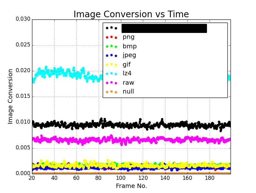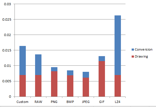 上面的图表(时间以秒为单位)是执行从NSData到UIImage转换所需的时间。PNG、JPEG、BMP和GIF几乎都是相同的。Null根本不影响转换,而是返回零。Raw是使用位图上下文方法转换的raw RGBA字节数组。自定义解压缩为原始格式,然后做同样的事情。LZ4是原始数据,使用LZ4算法进行压缩,因此它还通过位图上下文方法运行。