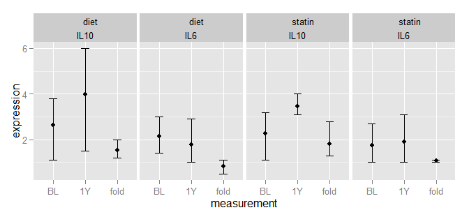 genes.long$measurement = factor(genes.long$measurement, levels=c('BL', '1Y', 'fold'))然后,您可以使用stat_summary()调用来绘制平均值和置信区间。使用小面分离各组(治疗和基因组合)。