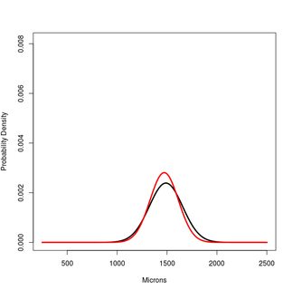 plot(x,a, type="l", lwd=3, ylim=c(0,1.2*max(a,b,c)), ylab="Probability Density", xlab="Microns")