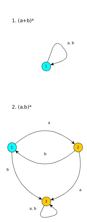假设有颜色的状态是开始状态和接受状态。(a+b)*可以理解为“0或多个a's和b's的任意顺序。”(a.b)*可以理解为“零个或多个a's和b's的顺序。”注意,如果序列中断,节点3以死状态存在以拒绝匹配。
