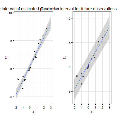 置信区间和预测区间是两种不同的野兽。前者是关于你的数据的平均值(拟合值),而后者是未来观察的所在。