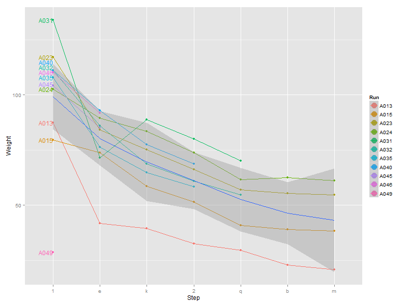 aes(x=Step,y=Weight,label=Run,group=Run,color=Run)) +