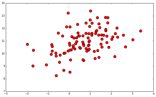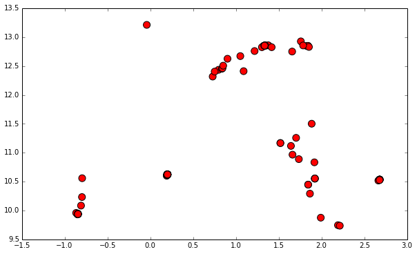 plt.scatter(cluster_centroids1[:,0], cluster_centroids1[:,1], c='r', s=100)