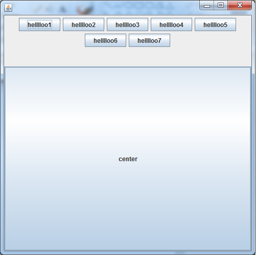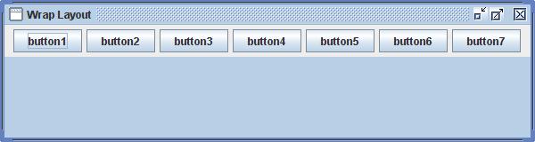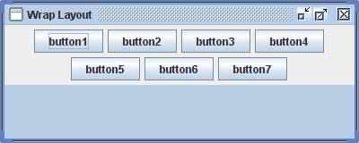 在下面的示例中,按钮面板添加到BorderLayout的北部,蓝色面板添加到中心。您使用WrapLayout的方式与使用FlowLayout相同: