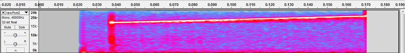 我试着用不同的采样率,在相同频率下比较两个记录的信号。第一信号以44.1kHz(第一光谱图)发送和记录,第二信号以48 khz (第二光谱图)发送和记录。正如你所看到的,它更清晰,在48千赫的失真较少。我不知道这些红色平行信号是什么。这是混叠效应吗?回声?即使在44.1KHz,信号也验证了Nyquist定理(信号的频率为20 the )。