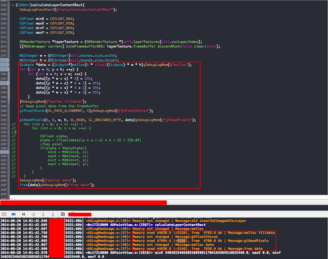注意,标记为红色的lines.malloc空闲对内存的区域是可以的,但是glReadPixels分配了一个额外的3M内存,我已经从glReadPixels官方文件文档中读取