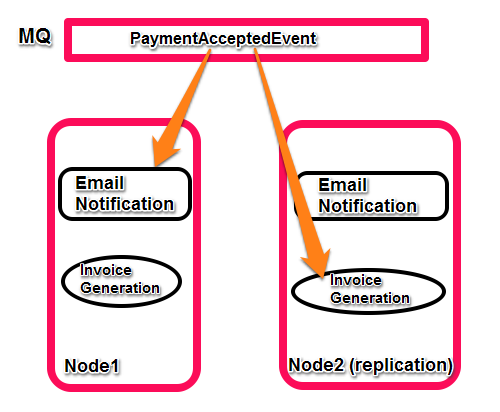 Node2是我们将要部署的服务器。业务要求是,在接受付款时,应向用户发送电子邮件,并在系统中生成发票。但是,部署了另一个节点,事件将由所有四个订阅者接收,这意味着用户将收到两封电子邮件,并生成两张发票。