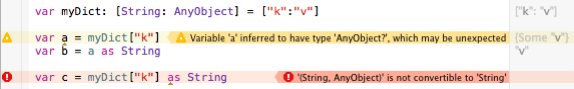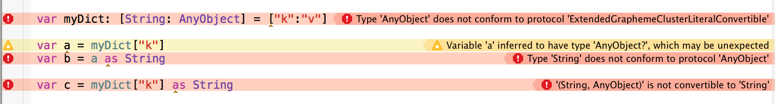 var myDict: [String: Any] = ["k":"v"]那一切都很好。因此,考虑到字符串不是对象,将类型为AnyObject?的变量转换为String肯定会产生错误。而且,由于编译器已经确定a是AnyObject?类型,所以它应该抱怨将a转换为String。