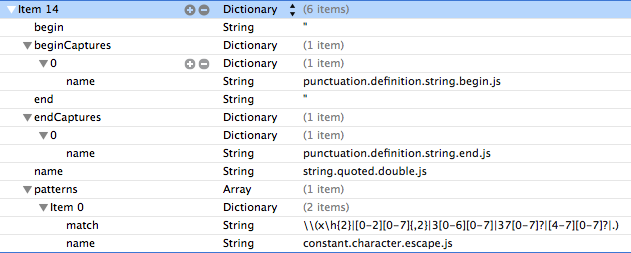 如果转义的字符实际上是反斜杠,那么棘手的一点是,对于JSON编码和正则表达式语法,有两个级别的转义。要匹配\",正则表达式需要转义反斜杠(\\")。JSON要求您转义反斜杠和双引号,导致\\\\\"在TextMate JSON语法文件中。因此,match表达式将是\\\\[\"\\\\]。
