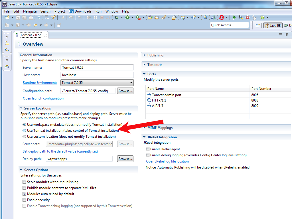 如果编辑Tomcat的server.xml (或context.xml或web.xml或它的/conf文件夹中不包含的内容)似乎没有任何效果,那么这是一个强烈的提示,表明您正在使用一个已经从Tomcat手中接管了控件的IDE。例如,Eclipse默认这样做。当您在Eclipse中添加Tomcat服务器时,它基本上会将其/conf文件夹的副本创建到IDE的服务器项目中,使用IDE工作区作为部署空间,并且只使用Tomcat服务器的引擎来针对服务器项目中的配置和工作区内的部署运行项目。