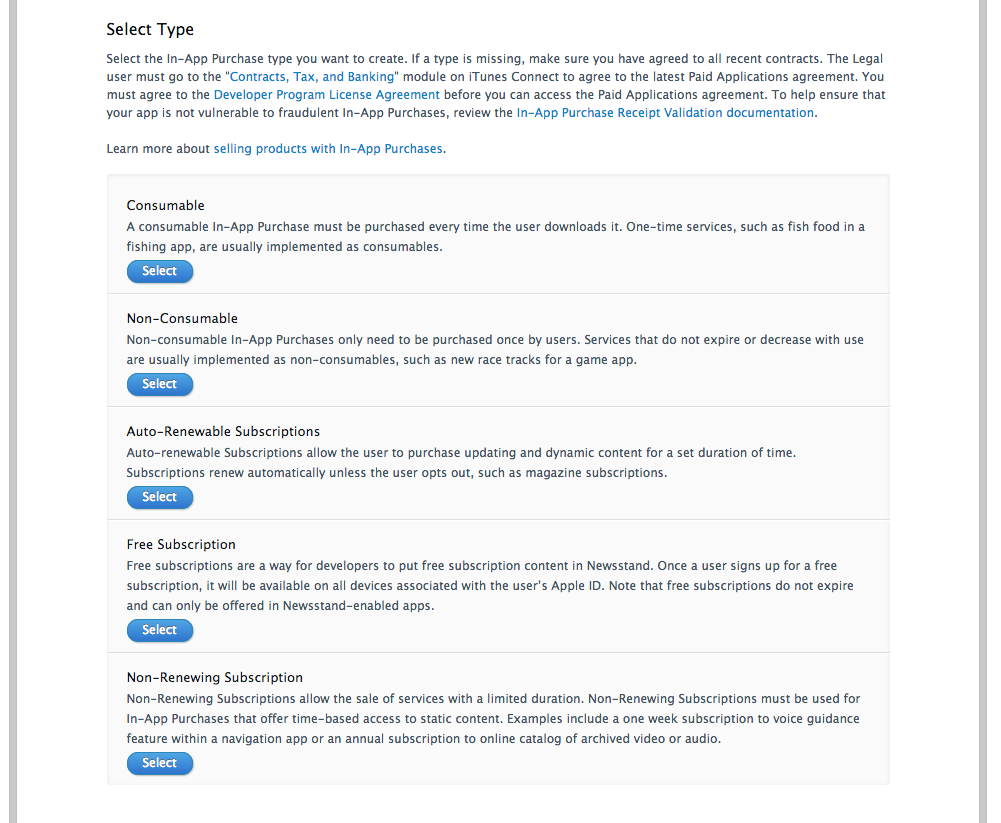 “选择要创建的应用程序内购买类型。如果缺少一个类型,请确保您已同意所有最近的合同。合法用户必须访问iTunes连接上的”合同、税收和银行业务“模块,以同意最新的付费应用程序协议。在访问付费应用协议之前,您必须同意”开发人员程序许可证协议“。要帮助确保您的应用程序在应用程序购买中不会受到欺诈行为的影响,请查看In-App购买收据验证文档。