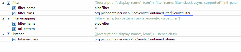 我自己就知道答案了。问题当然是org.picocontainer.web.PicoServletContainerFilter是抽象的。该类中有一个名为servlet过滤器的实现。在这里,工作图: