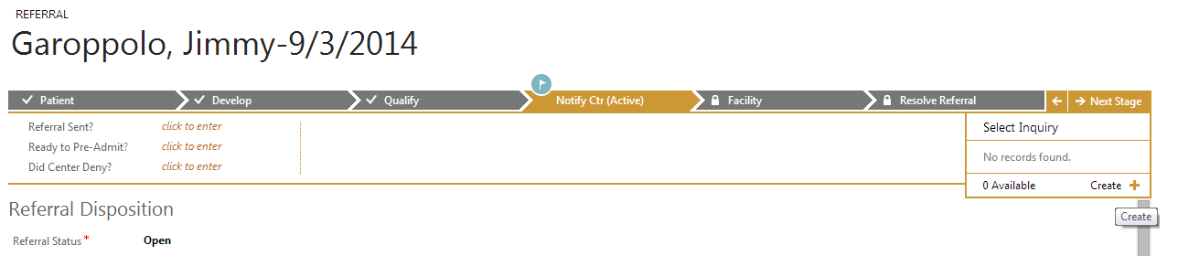 当试图将业务流程从引导流推进到机会流时,没有如下所示的Create +选项: