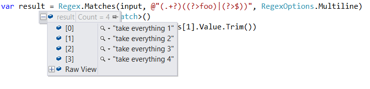 var result = Regex.Matches(input, @"(.+?)((?>foo)|(?>$))", RegexOptions.Multiline)