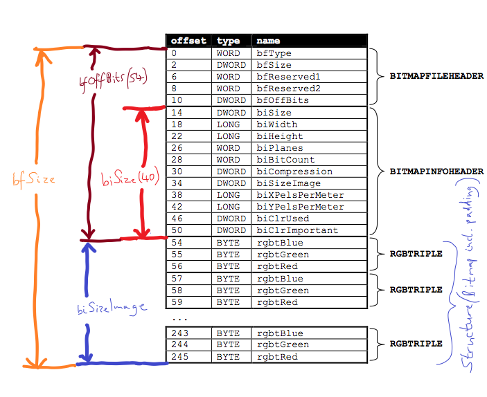 biSize = 40两个标头的组合大小实际上是bfOffBits (您可以将"Off“看作是指标题开头的实际位图的偏移量--记住,位图是直接出现在标题后面的)。
