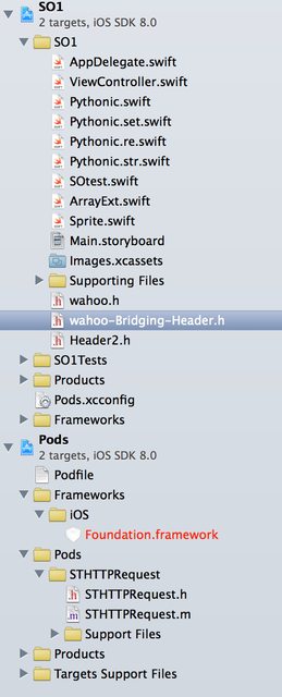 在通过CocoaPods向我的测试项目添加新的依赖项之前,我已经添加了一个C头文件('wahoo.h'),并通过桥接头文件“wahoo Header.h”将它公开到快速代码中。测试应用程序可以编译和运行,没有任何问题。