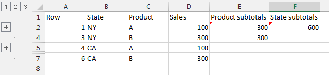 ws.Cell(2, 5).SetFormulaA1("=SUM(D2:D3)"); // subtotal for all NY, product A sales
