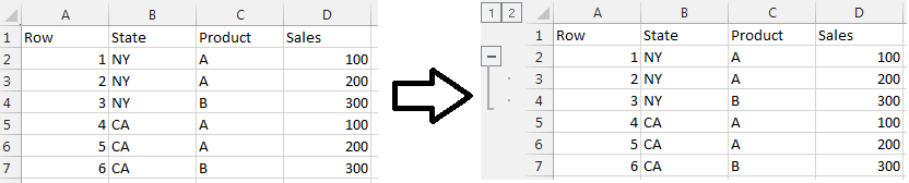 ws.Rows(6, 7).Group(); // group rows 5 to 7 (state CA), outline level 1