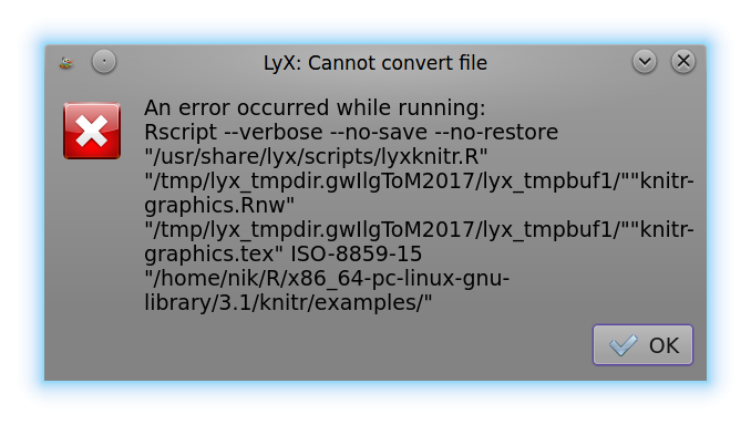 LyX 2.1.1也无法编译knitr-manual.lyx和knitr-graphics.lyx (目前已安装了编织版本1.6)。