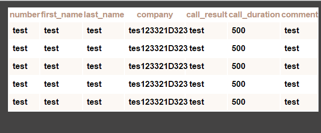 示例:{"number":"test","first_name":"test","last_name":"test","company":"tes123321D323","call_result":"test","call_duration":"500","comment":"test"}