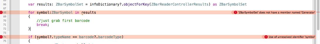 }错误出现在条件- "ZBarSymbolSet“没有一个名为”生成器“的成员。