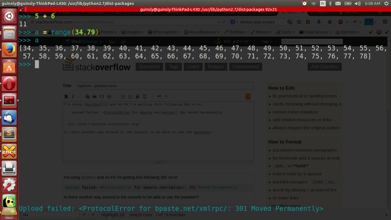 Upload failed: <ProtocolError for bpaste.net/xmlrpc/: 301 Moved Permanently为什么它要路由到/xmlrpc/?在控制台中还有其他方法可以使用巴斯特箱吗?Python 2.7.6 Ubuntu 14.04