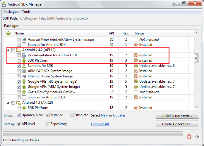 您需要安装Android4.4.2( API 19) SDK平台,而不是SDK构建工具。见下图。您是否有用红色标记的东西,如下面安装的图像中的那样?