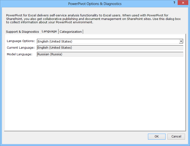 我注意到,在PowerPivot设置中,模型语言被设置为俄语,但我不知道如何更改它。