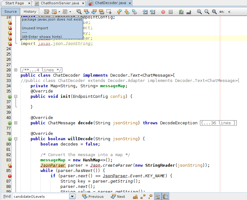 我正在处理一个Java项目,在这个项目中,我使用Tomcat 8作为服务器容器。我读到Tomcat 8使用Java 7容器,其中包含用于JSON处理的JSON处理API。利用Java 7特性的尝试一直失败,因为我不能从javax.json包导入文件。Netbeans报告程序包javax.json.json.*包不存在,如下图所示。我会感谢你的帮助,求求你!