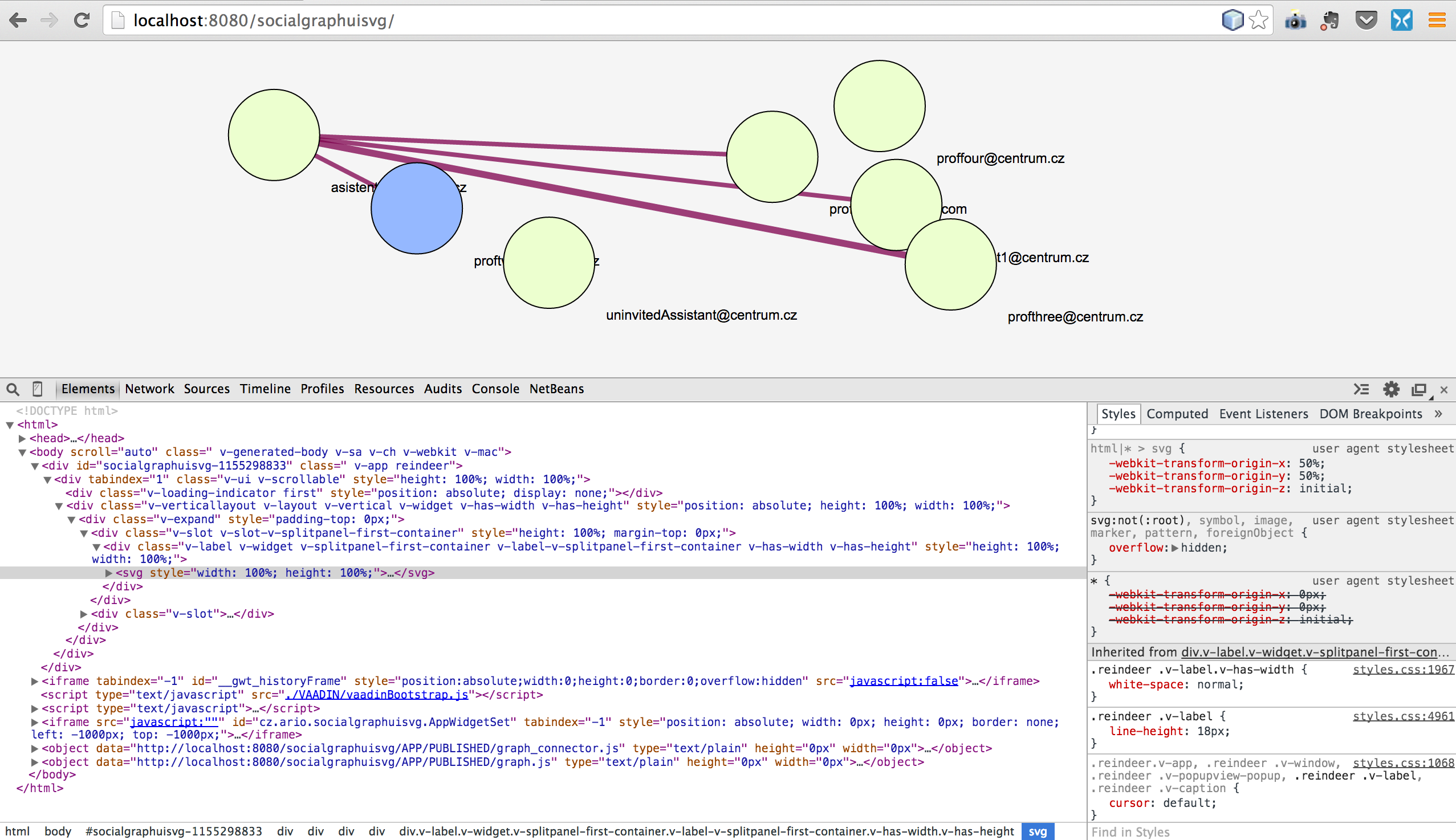 我的vaadin项目包括javascript组件,它用于绘制网络图。javascript组件使用d3.js库,网络图在父div元素中呈现为svg元素。