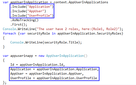 我看过您的代码,我认为问题在于您的映射。AppUserInApplication表与表SecurityRoles有多对多的关系,在映射中使用"OwnedCollection“--应该在一对多或一对一的关系中使用,尝试使用AssociatedCollection。