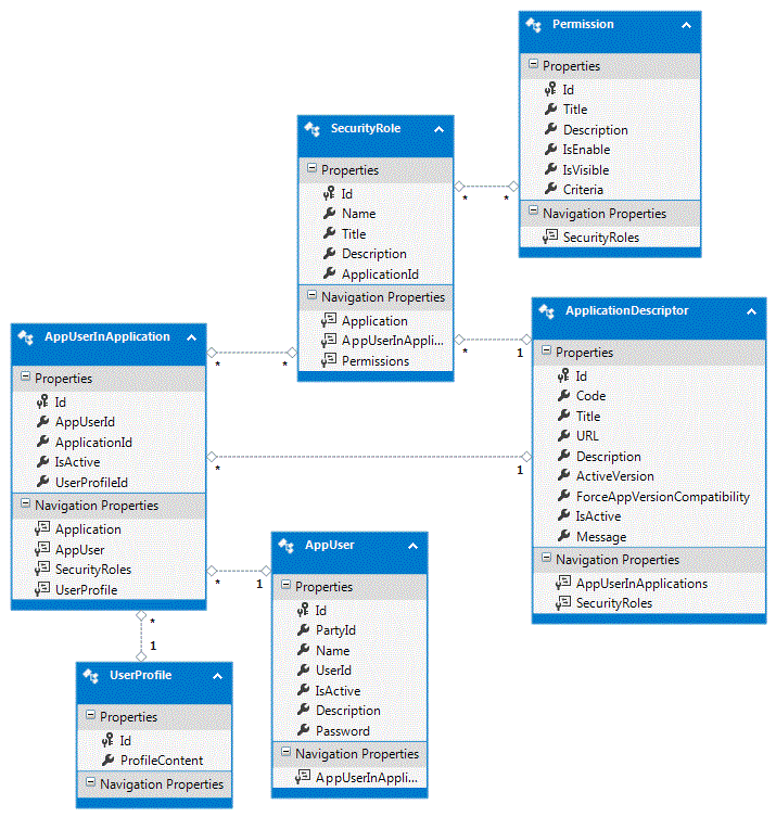 我在我的应用程序中使用EF code first 6.1和.NET 4,并在我的模型中有以下类(我剪切了图表中其他不相关的部分)。例如,Permission还有其他导航):