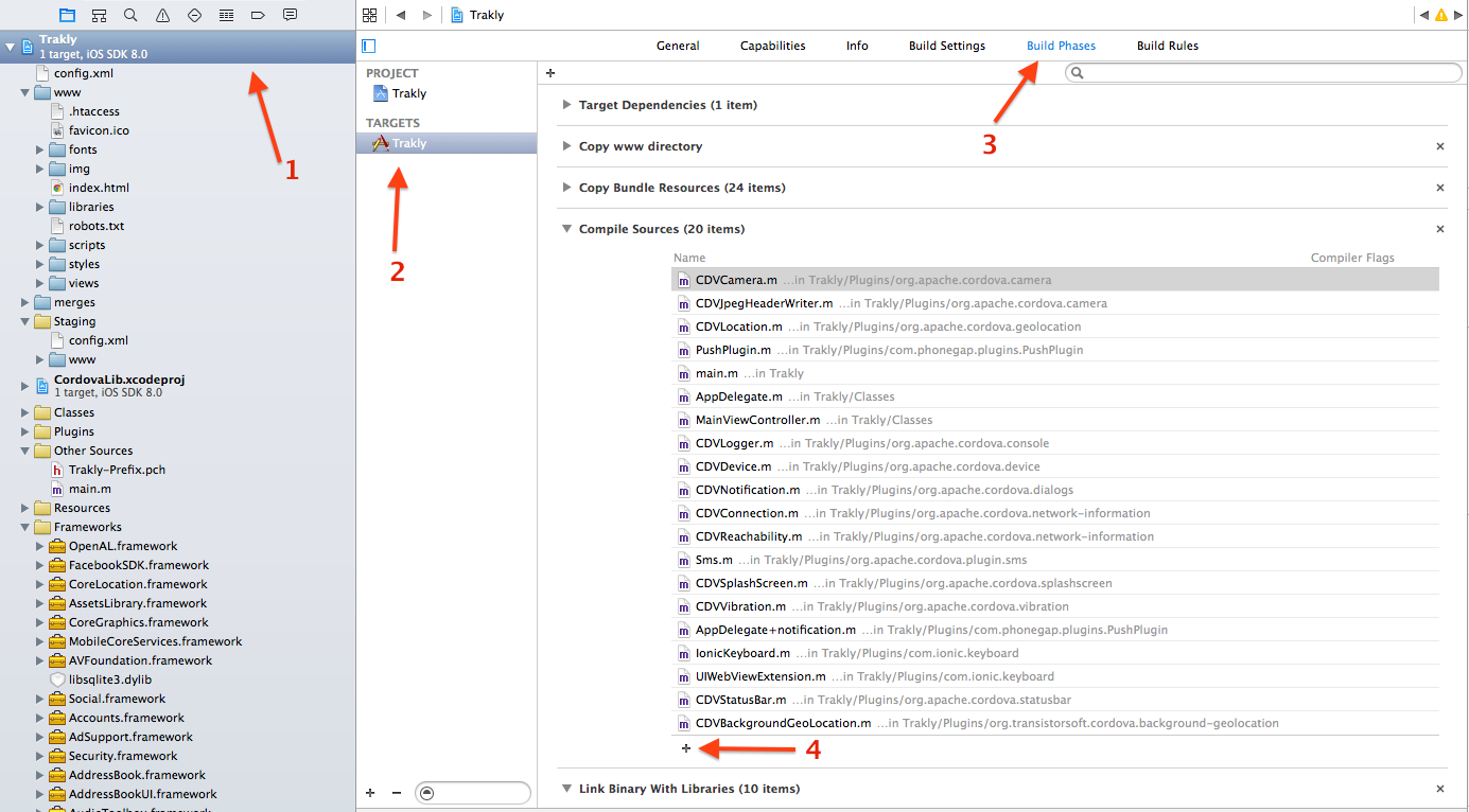在Xcode中,您必须在构建阶段添加插件源代码。