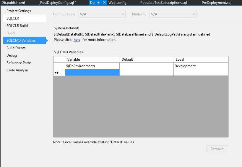 发布概要文件只是一个MSBuild项目格式的xml文件,所以没有什么疯狂的事情发生。如果您正在自动部署,则可以使用所使用的dacpac部署工具指定变量的默认值。我使用的是SqlPackage,它是SSDT的一部分。命令行参考