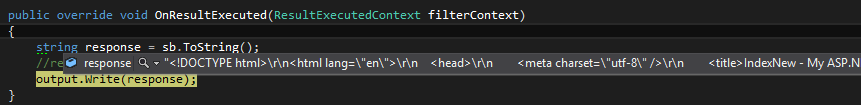}当您请求一个页面时,可以在OnResultExecuted()中自定义您的响应html。当你放置一个断点时,它会是这样的-