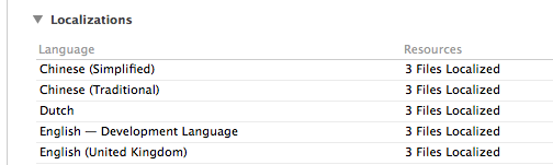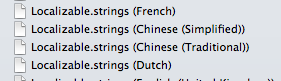 ...project/Resources/Locales/es.lproj/Localizable.strings因此,对于中文变体: