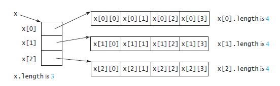for (int j = 0;j < map[0].length; j++) 例如,,假设x = new int[3][4]、x[0]、x[1]和x[2]是一维数组,每个数组都包含四个元素,如图x.length is 3所示,x[0].length、x[1].length和x[2].length都是4。