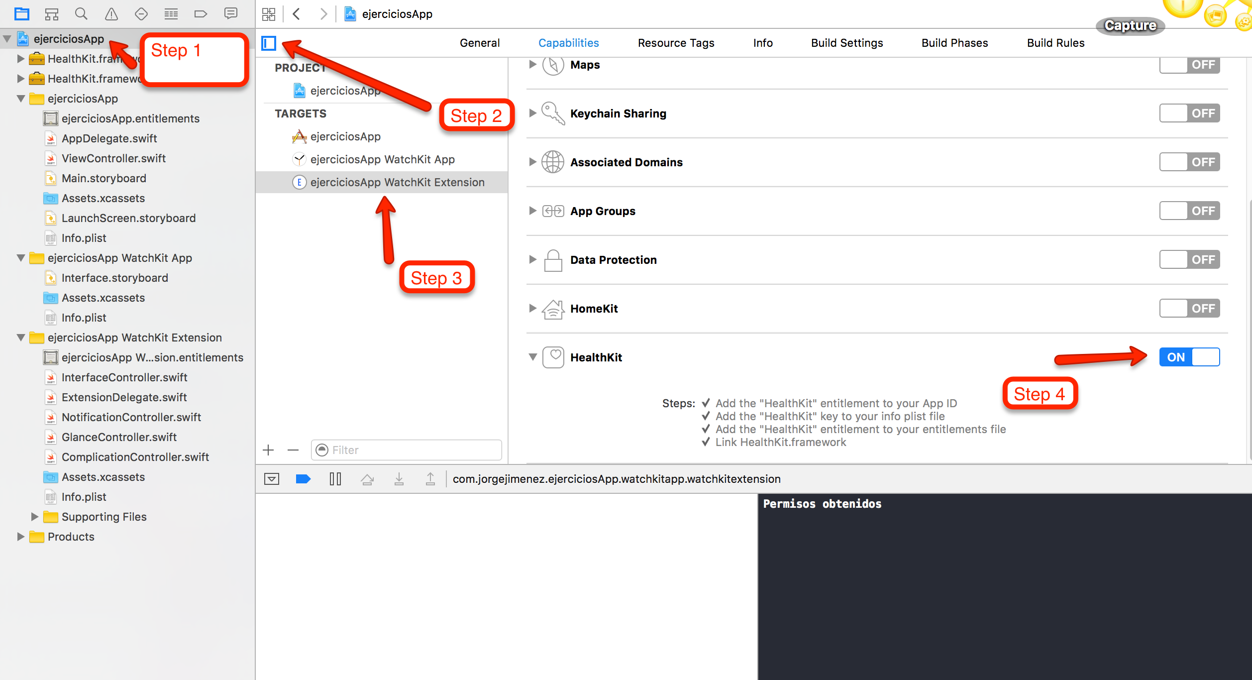 此错误是由于您没有向目标添加HealthKit权限这一事实。